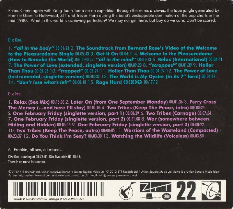 2: 01. Relax (sex mix) (16:00) / 02. Later On (from one september monday) (1:36) / 03. Ferry Cross The Mersey (...and here i'll stay) / 04. Two Tribes (keep the peace, intro) (0:24) / 05. One February Friday (singlette version, part 1) (0:39) / 06. Two Tribes (carnage) (7:54) / 07. One February Friday (singlette version, part 2) (1:08) / 08. War (somewhere between hiding and hidden) (4:15) / 09. One February Friday (singlette version, part 3) (0:22) / 10. Two Tribes (keep the peace, outro) (0:05) / 11. Warriors Of The Wasteland (compacted) (23:37) / 12. Do You Think I'm Sexy (3:30) / 13. Watching The Wildlife (Voiceless) (3:50)